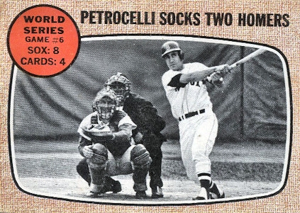 THE CURSE OF THE BAMBINO ... October 11, 1967 ... Dick Williams looked like a genius when he pitched rookie, Gary Waslewski in an elimination World Series game. Waslewski had a 2-2 big league record and had kicked around the minor leagues for eight years. Today, he had his sinker ball working well, except in the third inning when the Cardinals put together two runs. But he had a 4 to 2 lead after five innings. Rico Petrocelli had hit a home run in the second inning and in the fourth, the Red Sox set a World Series record by hitting three home runs, in one inning, off starter Dick Hughes. Carl Yastrzemski started the fourth with a homer into the left-field screen. After the next two men had gone out, Reggie Smith pulled a slider into the right-field corner grandstand for the second home run. Then the next batter, Rico Petrocelli, hit a fastball for a home run into the screen, his second in in his first two at bats.