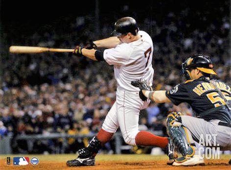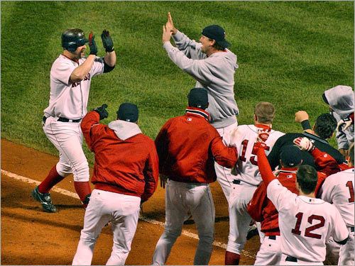 BAMBINO, PART 11 ... October 4, 2003 ... Nixon's parabolic, pinch-hit blast into Fenway's center-field bleachers gave the Red Sox a 3-1, 11th-inning, 24th-hour, controversy-spiced, walkoff win over the Oakland A's in the third game of their American League Division Series. It was one of the more remarkable postseason games in the 103-year history of the Red Sox, but mirrored many of the fantastic finishes that marked Boston's 2003 campaign. The A's lead the best-of-five series, 2 games to 1, but after a night in which they made four errors and committed two grievous base-running mistakes, they may have some ghosts of their own to shed after failing to close out the Sox. After Derek Lowe held the A's to an unearned run in seven innings, Mike Timlin, in a three-inning stint that was his longest of the season, and Scott Williamson set down the last dozen A's batters in order. Little had Pedro Martinez warming up before the ninth; had the Sox taken the lead, he would have been called upon to pitch. Nixon, who did not start against A's lefthander Ted Lilly, decided mid-game to emulate many of his teammates and shear his locks. More importantly, he took some swings with a Wiffle Ball bat against the offerings of assistant trainer Chang Lee to be ready when called upon. That summons from Little came in the 11th, after a one-out single by Doug Mirabelli, who had entered the game when catcher Jason Varitek was lifted for a pinch runner in the ninth. Nixon batted for Gabe Kapler and connected off the fifth A's pitcher of the night, rookie Rich Harden. His drive to dead center field left A's center fielder Eric Byrnes leaning disconsolately against the wall as it landed in the first two rows of the bleachers. after a one-out single by Mirabelli.