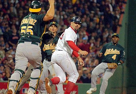 The Sox won despite going 0 for 10 with runners in scoring position, the heart of the order, Bill Mueller, Manny Ramirez, and David Ortiz, combining to go 0 for 13 last night. Of the three, Ortiz was the only one to get the ball out of the infield, lining out to center in the sixth. Ortiz is hitless in 13 at-bats in the series, Ramirez is 1 for 12 (and was booed), while Mueller is 2 for 14. Even though the A's made four errors in the first four innings, including three in the second inning, and two A's base runners were called out at home, both for stopping short of touching the plate, through six innings the only run the Sox were able to score came on an interference call against Eric Chavez, Oakland's Gold Glove third baseman. It came during a rundown play in which the trapped Sox runner, Varitek, smartly threw a forearm into Chavez and was judged the innocent victim.
