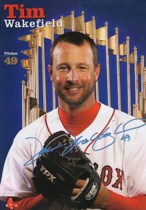 THE "IDIOTS" REVERSE THE CURSE May 18, 2004 ... In a dandy performance on a night his knuckler danced, the sleep- deprived new father, Tim Wakefield befuddled the beleaguered Devil Rays over seven innings to propel the Sox to a 7-3 victory before a crowd of 12,836 at Tropicana Field overrun with Boston fans. Wakefield, 37, made the 400th appearance of his resilient career after a chaotic three days in which he traveled from Toronto to Boston for the delivery, drove Stacy and the baby home, then rushed to Florida to rejoin the team. Wakefield allowed only one run on three hits and a pair of walks, but he readily confessed he needed all the help he could get from Doug Mirabelli, his catcher and close friend. Sox hitters presented Wakefield their own baby gift by erupting for five runs in the seventh inning to break open a 2-1 game. Mark Bellhorn put a bow on it by launching a three-run homer off reliever Jeremi Gonzalez after Gabe Kapler and Johnny Damon touched Tampa Bay starter Mark Hendrickson for run-scoring doubles. Bill Mueller, who went 3 for 4 as he returned from a three-game absence because of an inflamed right knee, started the game- breaking rally by doubling off Hendrickson. Pokey Reese (2 for 3 with an RBI) also scored after reaching on a sacrifice fielder's choice. But nobody gave Hendrickson a harder time than Manny Ramirez, who went 3 for 4 with two doubles and a walk to improve to .533 (8 for 15) against the lefthander. All in all, the Sox were pleased to win it for Wakefield. The Sox ruined the 500th game at the Trop for the Rays, who lost for the 18th time in 21 games. In losing their first four games against the Sox this season, the Rays have been outscored, 24-6, while batting .167 (21 for 126). For Wakefield, the greatest challenge was surviving the first inning. Lightning-fast leadoff hitter Carl Crawford made things difficult by beating out a grounder to second base. Crawford stole second for his league-leading 19th steal before he advanced to third when Rocco Baldelli lined to right. He scored on Tino Martinez's ground out. Otherwise, the Rays were easy prey for Wakefield, who improved to 9-1 with a 2.61 ERA against them in his career. After Crawford's single, Wakefield retired 15 of the next 16 batters before he needed to snuff a minor threat in the sixth. He yielded after the seventh to Scott Williamson, who allowed a run in the eighth. Mike Timlin took it from there, surrendering another run in the ninth in clinching the victory, which ranked among the most precious of Wakefield's career. Count Pokey Reese among the players who support Major League Baseball's decision to provide financial support for 29 surviving Negro leagues players. MLB gave the former players the choice of accepting nearly $40,000 over four years or $375 a month for life. The players had received $10,000 each from MLB in 1997. "I think it's great," Reese said. "They paved the way for players like me to get an opportunity. I think it's right what MLB is doing." |