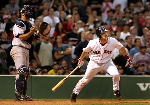 when the passive Red Sox finally fought back. And we mean fought. Jason Varitek shoved his catcher’s mitt into the face of A-Rod in the third inning and before the day was over there was a bloodied Yankee, 5 ejections, 21 runs, 27 hits, and 4 errors in 3 hours 54 minutes of hard-nosed