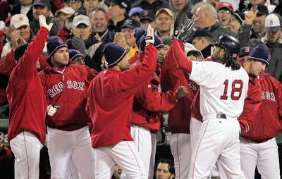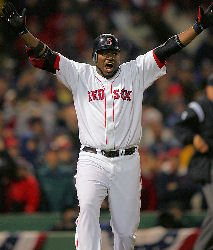 THE "IDIOTS" REVERSE THE CURSE October 18, 2004 ... David Ortiz and the Red Sox just beat the Yankees in two extra-inning playoff games on the same calendar day. In perhaps the most thrilling and torturous postseason game in 104 years of Red Sox baseball, the Sox beat the Yankees, 5-4, when the mythic Ortiz singled home Johnny Damon from second base in the bottom of the 14th at 10:59 p.m. It came less than 23 hours after the same Ortiz cracked a walkoff homer to win Game 4 at 1:22 this morning. The Hub has never seen two days of baseball drama like this. The Yankees have to be wondering what hit them the last two nights at Fenway. New York embarrassed the Red Sox, 19-8, Saturday, taking what looked like an insurmountable lead in the series. But now the Sox have pushed the issue back to the Apple and both teams have depleted bullpens. Tim Wakefield was right in the middle of it. In that last inning, he was on fumes. He pitched the last inning on heart. Game 5 featured 35 players, including 14 pitchers. Wakefield, the man who was on the mound when the Yankees broke the Sox' hearts in 2003, dazzled New York with three innings of one-hit, shutout, shout-out relief.