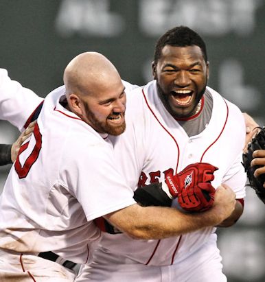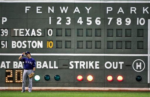 So Zink, who didn't last the requisite five innings, could not get the win, even if the bullpen hadn't let the Rangers tie the score in the sixth. It seemed he might be able to get through the fifth when Coco Crisp appeared to make a nice play on the warning track in center field. But the umpires ruled that Crisp didn't make the grab, even as the center fielder was saying he dropped it on the transfer. Francona took some time with the umpires, and when the ruling went against him, he walked directly to Zink to relieve him of the baseball. Still, the Sox got yet another boost when Youkilis followed the Ortiz double with his 21st home run of the season, extending the lead to four runs, not enough of a cushion for a beleaguered Sox bullpen. With 12 runs already scored by the Red Sox, the Rangers stepped to the plate in the fifth inning against Zink. Eight runs scored. They stepped to the plate in the sixth against reliever David Aardsma. Five runs scored. It was, in a word, horrific. When Frank Catalanotto crossed the plate in the sixth, it was stunning. Chris Davis's grounder had bounced off Youkilis, a rare error for the first baseman, to Pedroia. In a move that seemed desperate, Pedroia threw home, but the ball came in high, not leaving Kevin Cash enough time to get the tag down, and the Rangers had tied the game. It was their 14th run of the evening, tying the Red Sox 14-14, and marking a remarkable comeback from a 10-run deficit in the first inning. And the Rangers weren't done, a sacrifice fly by Ian Kinsler relieving the Red Sox of their lead for the first time. It was now 15-14, in favor of the Rangers, and there were boos. The 16th run brought more jeering, and Francona out of the dugout, leaving a dejected Manny Delcarmen to fend for himself in the wilds between the pitching mound and safety. He was just another failed arm out of the bullpen, turning what had been a possible turnaround stretch for the relievers (three runs in the last 26 innings) into a chance for the paying public to vent its frustrations. Now, with the score knotted at 16 in the eighth inning and David Ortiz having just been walked intentionally, Kevin Youkilis laced a pitch off the pillowy facade of the Sports Authority sign in left field for yet another three-run home run. It bounced off the sheeting, lifting Youkilis and the Red Sox and a crowd that had its boos turned to cheers to a ridiculous 19-17 win over the Rangers at Fenway Park in front of 38,004 dazed fans. Not that it stopped there, of course. Even Jonathan Papelbon couldn't make it easy, allowing an extra run for the Rangers in the top of the ninth. But a liner to second base finally closed it out, relief flowing through the park far more than joy. The total of 36 runs tied the American League record, one the Red Sox helped set themselves in 1950. With the save, Jonathan Papelbon tied Dick Radatz with 104 saves, second-most in Sox history. |