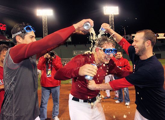 But then, it was all gone in an instant. The jubilant feeling in the stands, and in the dugout, as Torii Hunter sent a single out to right field in the eighth inning. Mark Teixeira and Vladimir Guerrero, both on base on walks, advancing on a passed ball by Jason Varitek, came home to tie the score at 2-2. So while Lester might not have been scored upon, the Red Sox bullpen wasn't quite so lucky or so good. The Angels almost did it, a squeeze attempt in the ninth with Reggie Willits on third, was snuffed out when Varitek ran down one of the fastest players in the league. Aybar had whiffed on the bunt try, and Willits was caught off third. And the Sox, at that point, knew they weren't going to lose. It would almost seem that this should be rote by now, as the Red Sox have been back to the playoffs, and won in the playoffs, over the last six seasons. But it has not, as evidenced by the bounding, bouncing, joyous celebration that wound itself from the dugout to home plate to first base where Lowrie was engulfed.