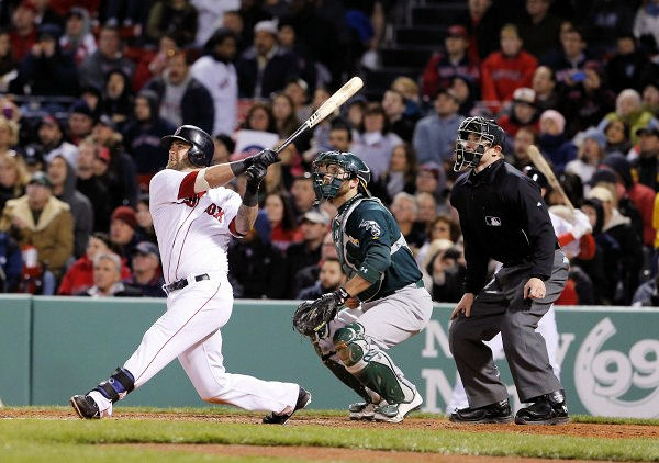 BOSTON STRONG - April 22, 2013 ... Mike Napoli banged a grand slam over the Green Monster on Monday night to lead Boston to a 9-6 romp over the Athletics. When Napoli stepped to the plate with the bases loaded and no outs in the fifth, it was still a close game, at 4-3. But that changed with one swing by Napoli, who leads the Major League in RBIs, with 25. Napoli is thriving in his new environment, taking aim at all areas of Fenway. Last Monday he banged a walk-off double off the Monster. This time he cleared it for his fourth career slam. Earlier in the contest, he smashed an RBI double down the line in right. It's a good thing the Red Sox eventually stretched the lead to six runs, because the A's came back to make a game of it in the eighth, scoring three runs against Clayton Mortensen. That inning could have been worse if not for a fine running catch in right field by Shane Victorino to rob pinch-hitter Eric Sogard of a two-run double. Though it was a bitterly cold night, the Red Sox looked comfortable at the plate. Will Middlebrooks also cleared the Monster, belting a three-run homer that signified he might be ready to break out of a prolonged slump. With all that offense at his back, Felix Doubront went 6 2/3 innings for the win, his second of the season. The lefty gave up three hits and three runs. He walked five and struck out eight, throwing 113 pitches. It was a night to forget for Athletics right-hander A.J. Griffin, who got himself into trouble in the fourth when he hit Napoli with the bases empty and two outs. Joel Hanrahan threw in the bullpen for the first time since being sidelined and said he felt fine after 30 pitches. Hanrahan will start a minor league rehabilitation assignment this weekend. John Lackey made a rehab start for Double A Portland and looked good against Binghamton. The righthander, who left his start April 6 with a strained biceps, threw 32/3 scoreless innings. Lackey allowed three hits, walked two, and struck out five. He threw 67 pitches, 45 strikes. Lefthander Franklin Morales had his latest rehab start delayed. Lefthander Craig Breslow, who is coming back from a sore shoulder, will start a rehab assignment in Portland, then pitch for Triple A Pawtucket. |