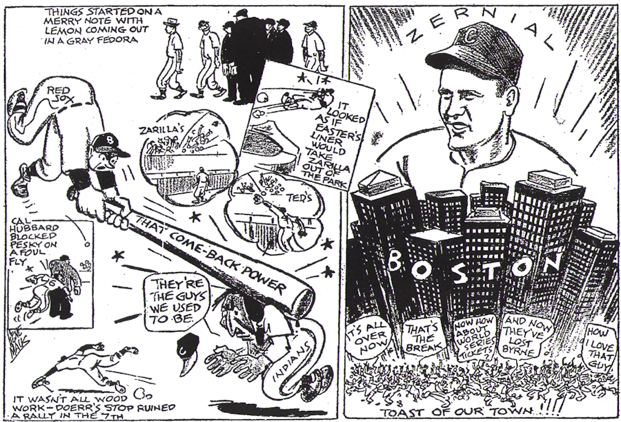 ON THIS DATE (September 21, 1949) ... Ted Williams hit his towering 41st home run in the seventh inning to give the Red Sox a lucrative 9 to 6 win at Fenway Park. The Red Sox got help from the White Sox, who rallied to beat the Yankees and cut their lead to just two games. The scrappiness and confidence of the Red Sox was very apparent in this game. Two times they came from behind to go ahead of the Indians. This hard way triumph gave Ellis Kinder his 22nd win of the year, not to mention his 12th in succession and the 19th consecutive victory for the Red Sox at Fenway Park. No team has won a game at Fenway Park since August 10th. Kinder pitched two-hit shutout ball over the final three innings in a relief role, to help the Red Sox gain a full game when the Yankees. Jack Kramer started for the Red Sox and when he left the game in the fifth inning, it looked like he would be charged with a loss. The Indians scored in the second on a single by Bob Kennedy, a pass to Jim Hegan, and a single by Mike Garcia, the Indians pitcher. The run was equalized in the second inning on a double by Bobby Doerr, a long fly ball out by Al Zarilla, that moved Doerr over to third and a ground ball by Billy Goodman that scored him. It was a pitcher's duel until the fifth inning, when both Garcia and Kramer were taken out of the game. Garcia started Kramer on his way to the showers, when he singled in the top of the fifth inning. Dale Mitchell also got a base hit and both players were sacrificed along by manager Lou Boudreau. Mickey Vernon singled Garcia across and Larry Doby flied deep enough to Dom DiMaggio to score Mitchell. Easter lined a double to right-center that scored Vernon. Manager Joe McCarthy had seen enough and brought in Walt Masterson, who got Kennedy to ground out. Down 4 to 1, the Red Sox saw that eight runs had been posted by the Yankees in their half of the third inning. But they stormed back and gave Garcia a taste of his own medicine. With one out Birdie Tebbetts singled to left and pinch-hitter Tom Wright lined a double to left-center. Dom DiMaggio walked to load the bases. Garcia threw three balls to Johnny Pesky and immediately was replaced by Bob Feller. Feller completed Pesky's free pass to score Tebbetts. Williams lofted a deep fly ball to Easter in right field that brought home Wright after the catch. DiMaggio went to third and Pesky went to second on the play, coming home with the tying and go-ahead runs, when Vern Stephens lined a single to left. Al Zarilla put the Sox up by two in the sixth inning when he sent his 10th home run of the year into the first row the bleachers behind the Red Sox bullpen. Chuck Stobbs, who had come in to pitch in the sixth inning was chased in the seventh. The Indians cut the Sox lead to one on two walks and a double. Now Kinder came in from the bullpen to try and put out the fire. With runners on second and third, Kinder intentionally walked Kennedy the load the bases. He got Johnny Berardino out on a terrific smash to right-center that Zarilla grabbed on the dead run. Al had no chance to get Larry Doby, who scored from third after the catch, and the game was tied at six apiece. Thurman Tucker came up to pinch-hit for Hegan and Kinder got him swinging. Early Wynn pinch hit and slapped the ball to Bobby Doerr's right. Doerr raced over and backhanded it, throwing out Wynn by a whisker for the final out. So with the score tied at 6 to 6, Steve Gromek came into pitch. Williams greeted him with a deep home run that was hit just out of the reach of Luke Easter, into the Red Sox bullpen to put the Sox back on top. Stephens doubled to left and Bobby Doerr sacrificed Stephens over to third. He scored on Billy Goodman single down the left-field line, for an 8 to 6 insurance run. The Sox put it in the freezer in the eighth-inning. After Stephens had singled, Bobby Doerr lined a triple to the gap in right-center for the Red Sox ninth run. |