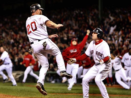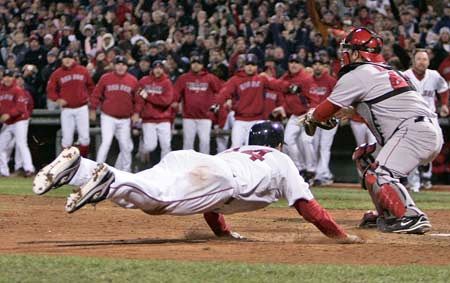 But then, it was all gone in an instant. The jubilant feeling in the stands, and in the dugout, as Torii Hunter sent a single out to right field in the eighth inning. Mark Teixeira and Vladimir Guerrero, both on base on walks, advancing on a passed ball by Jason Varitek, came home to tie the score at 2-2. So while Lester might not have been scored upon, the Red Sox bullpen wasn't quite so lucky or so good. The Angels almost did it, a squeeze attempt in the ninth with Reggie Willits on third, was snuffed out when Varitek ran down one of the fastest players in the league. Aybar had whiffed on the bunt try, and Willits was caught off third. And the Sox, at that point, knew they weren't going to lose. It would almost seem that this should be rote by now, as the Red Sox have been back to the playoffs, and won in the playoffs, over the last six seasons. But it has not, as evidenced by the bounding, bouncing, joyous celebration that wound itself from the dugout to home plate to first base where Lowrie was engulfed. The celebration continued past the midnight hour, as players and team executives toasted one another and took photos with their children on the infield while fans lingered by the dugout. It was still going at 12:24 when the ballpark organist broke into "The Impossible Dream." The Fenway lawn and home clubhouse should be dry by the time the ALCS comes to Boston. Bring on the Rays. Bring on the Dodgers or Phillies if you like. There is plenty of champagne left in New England and Mayor Menino has sent the duck boats to have their tires rotated.