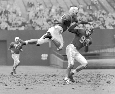 On that play, Don James, the Miami quarterback retreated with the ball looking to pass, but was harassed by B.U.'s end Jim Meredith.  Meredith drove James to the goal line where the quarterback bumped into his fullback Bob Mosketti, jarring the