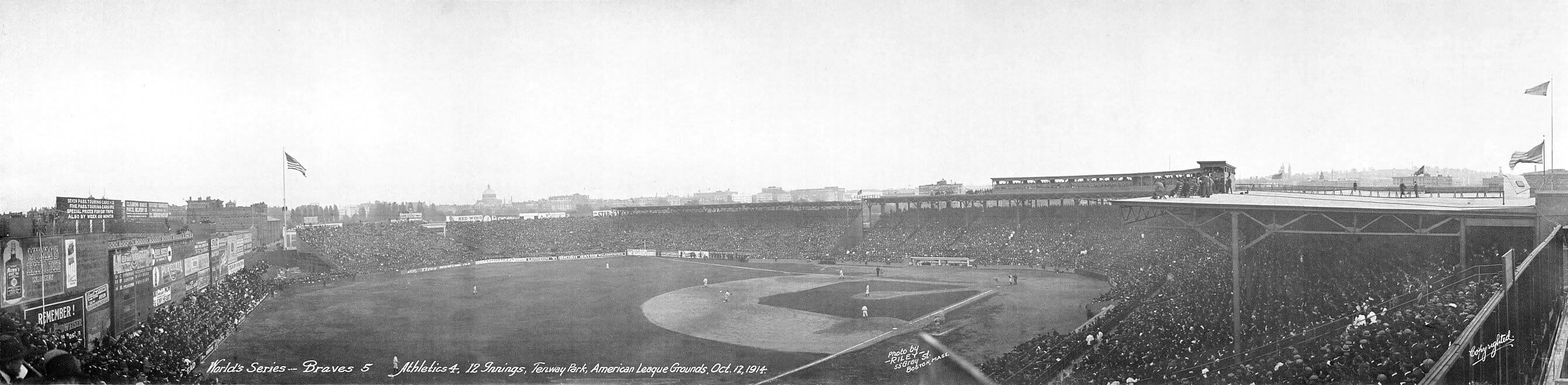 ON THIS DATE (October 13, 1914) ... Before the last ball of the World’s Series, Stuffy McInnis’ bounder, had gone halfway from Charlie Deal to Butch Schmidt across the diamond, the fans were pouring over the fences in a torrent. As the ball was safely caught, the Braves’ outfield started for their dugout, running as if for their lives before an infuriated mob. Every one of them made it; the bats were snatched in, and the whole club ducked hastily into the clubhouse. Only one player missed it, and he was promptly raised to men’s shoulders. It was only by the warmest sort of argument that he prevented his admirers from carrying him in triumph around the field. The fans swarmed round the dugout, thicker and thicker. From every stand they came, the whole playing field black with them, until one wondered how such a great multitude had ever been compressed into the seating space. The Athletics, in their mackinaws, came over in a group to shake hands and congratulate their opponents, now that the war was over. Only Connie Mack was missing, and he hung back, talking with friends, near his own dugout. All this took place in the fraction of a minute. By that time the Royal Rooters were formed up and ready to march. They came gaily around the field, stepping to cheer in front of the now empty Athletics cave, and marched straight into the gathering throng until they jammed there. They cheered, and would have cheered some more, but it was evident that there would be speechmaking shortly. The Rooters had other business, so they somehow skew jawed their band around, headed out of the press and went triumphantly on their way. Still the fans came, until there must have been more than 5,000 packed in a solid mass in front of the Braves’ camp. The crowd, dense to the very back, extended more than half-way across the diamond. Back of it people stood on chairs, many of them were women who were held in place by the most affectionate embraces, and didn’t mind it a bit. Mayor Curley came out on the roof of the dugout and addressed the crowd. He was eloquent, anybody could see that. But he was not satisfactory. What the crowd wanted was not Mayors, but Braves. And the Braves were for the moment engaged in personal adornment, getting rid of soil and into the garments of everyday life. Long before the Royal Rooters’ phalanx thumped in and across the field the last seat in the park was taken and round the smooth, level field a living wall, the center of a world anxiously banging on the ends of thousands of telegraph wires, waited for the supreme moment of the World’s Championship fight. The band played “The Star Spangled Banner” and as everybody rose and took off their hats the grandstand suddenly like a great pool table with bald heads for balls, scattered about thickly on its surface. The fans got action from the very jump out of the box, for Dick Rudolph’s first chuck was a strike. “Hey,” shouted the stands. Up went another swift one: whack! went the bat, and whiz – Johnny Evers to Butch Schmidt – and “Whee!” said the fans. Rube Oldring popped up a foul to Hank Gowdy, and once more the crowd yelled. The game was under way smartly, and doing business on every ball pitched, almost. A little later Oldring got a good-natured, ironical “hand” from the Royal Rooters for his hit, the only one he made in the World’s Series. Presently a foul ball dropped just outside the third-base stand. A fat fan jumped the fence, picked up the ball, waved it triumphantly and calmly put it in his hip pocket before climbing back to his seat. The crowd shouted with laughter – a Gargantuan rumbling, laughter – at his deliberation. And then, when the hits began to fly in the fatal fifth, and the championship of the world was put on ice, the real roar began, and never did cease again until the inning was finished. In the ninth there was one last comedy. A ball dropped in deep centerfield and Possum Whitted, a policeman and two or three fans started after it. The fan got it first; the policeman fell on him, one or two others fell on the policeman, and the whole mess was rolling on the ground, until Whitted came down on them and took the ball away from the lot of them. It took until dark to get all the people out of the park, and when they all fully realized that they had seen a World’s Series won it took them no time at all to start celebrating. In consequence, some of yesterday’s crowd hasn’t got home yet.
