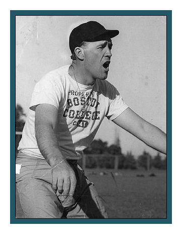 Frank Leahy was born on August 27, 1908 in O’Neill, Nebraska. Leahy was born in O'Neill, Nebraska and graduated from Winner High School in Winner, South Dakota where he was a football standout. Leahy played at Notre Dame under Rockne in 1929, but a knee injury in 1930 ended his playing career. While he was recuperating from a knee operation, he shared a hospital room with Rockne, who was struck with Leahy’s football acumen and made him informally a coach of the tackles until his graduation in 1931. Leahy graduated from Notre Dame in 1931 and went to Georgetown as line coach in 1931, then to Michigan State the following year to take a similar position. He took over as line coach at Fordham in 1933 and stayed until 1938 under Jim Crowley, coaching the famed "Seven Blocks of Granite" from 1935-37, when the Rams lost only two combined games. In 1939, Leahy went to Boston College as head coach, guiding the Eagles to a 20–2 record including an undefeated 1940 season capped off with a win in the 1941 Sugar Bowl. Although he had recently signed a contract renewal at Boston College, Leahy accepted the head coaching position at his alma mater, Notre Dame. He tried without success to get out of his BC contract. He pleaded to the school's vice president. When that didn't work, he went to the mayor of Boston. Then the governor of Massachusetts. Then, at a press conference, he told 50 reporters what the South Bend Tribune called "the biggest lie of his life". Leahy stated: "Gentlemen I've called you all here today to inform you that I recently received my release from my coaching contract. With the release went the good wishes and benediction of Boston College." Leahy stepped away, and the buzzing group of reporters battled for phone lines. A phone call came in for Leahy, and he took it. The vice president of Boston College was on the line. "Coach Leahy," he barked. "You may go wherever you want, and whenever you want. Good-bye."
