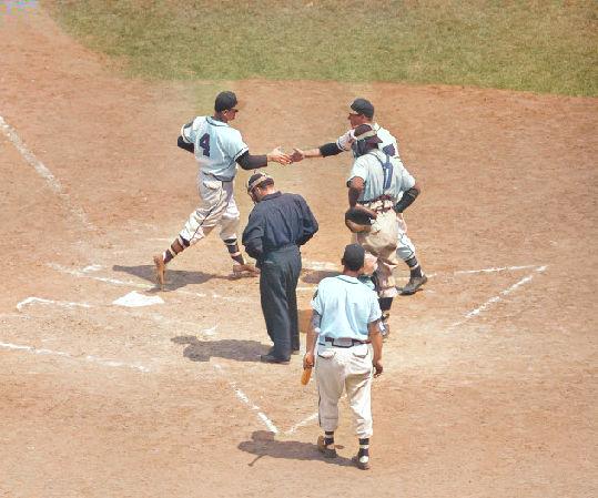 rushed in to grab the throw back from his catcher and umpire Al Barlick waived