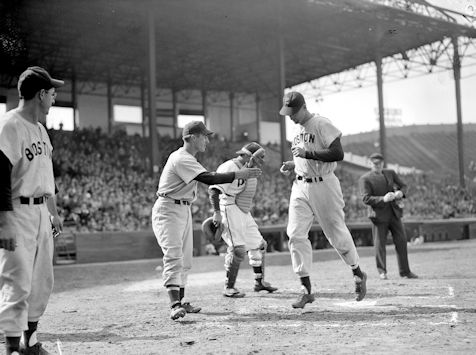 Williams started with a single to center off Sain against the "Williams Shift". He homered with two men on against Shoun in the second inning. The homer was a thing of beauty, according to the Red Sox players. On a 3-0 pitch, the ball was sent flying high and far over the centerfield barrier. The mark at that point is 390 feet and there's no telling how far it would've gone up in the centerfield bleachers at Fenway Park. Ted singled to left in the fifth inning, reached on an error in the eighth, and scored both times. He didn't hit one to right-field all afternoon against the shift. Williams' performance alone was almost sufficient to beat the Braves, but he had plenty of help as the Sox piled up 24 base hits of all types.