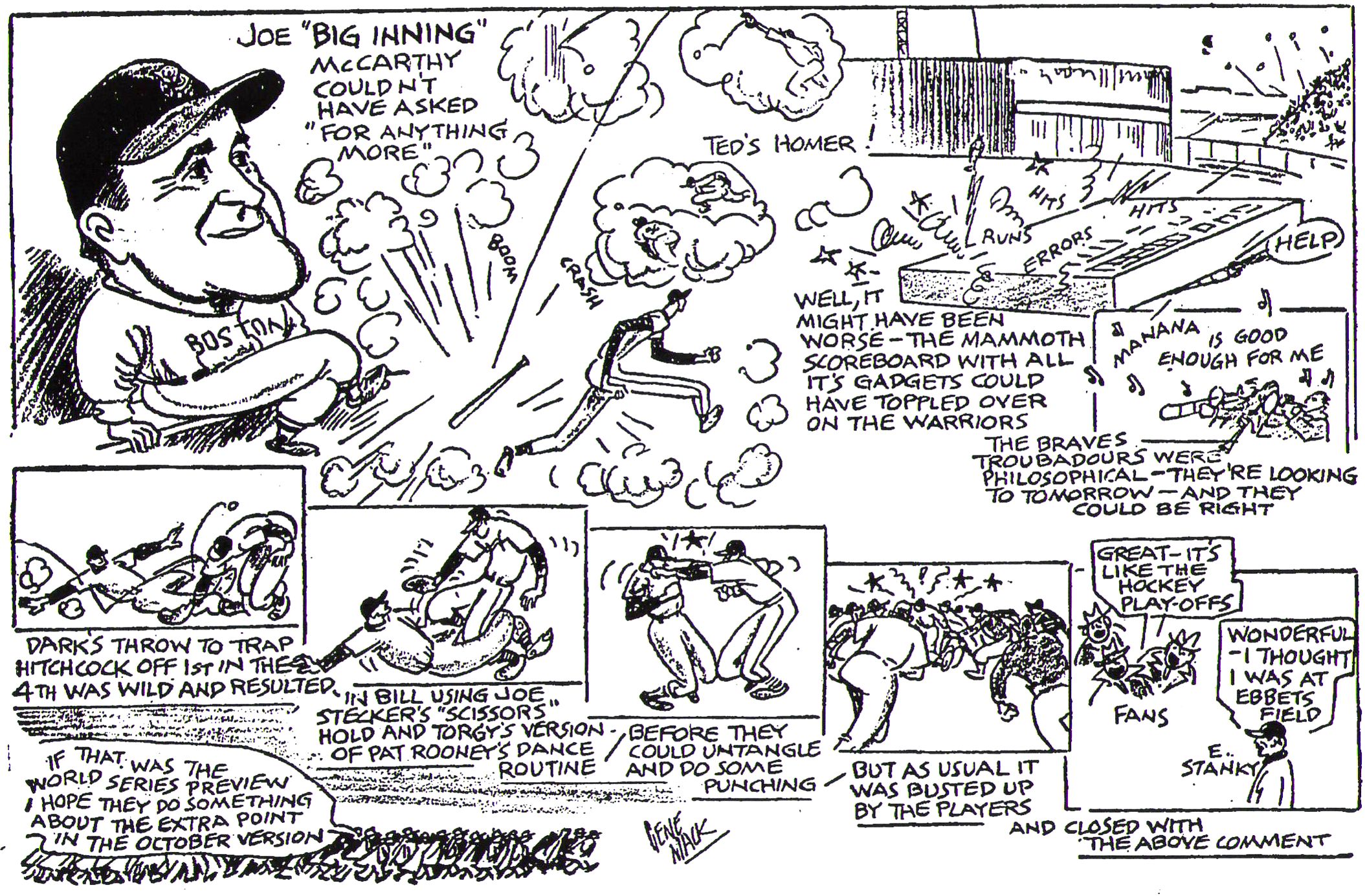 As odd as it may seem, some baseball was played, but most of it was on the part of the Red Sox. The Braves did score 6 runs on 11 hits as Stanky and Phil Masi were the only Braves to get more than one. The Sox powdered Johnny Sain, Clyde Shoun, Ed Wright and Red Barrett in rapid succession. Before the first three innings were completed, the Braves had rushed three pitchers to the mound.