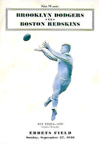 BOSTON'S NFL EAST CHAMPS September 27, 1936 ... Capitalizing on almost every break their opponents gave them, the Boston Redskins walked off with their second victory in the National Football League today when they turned back the Brooklyn Dodgers at Ebbets Field. The Redskins cashed in heavily on two quick breaks that gave them both their touchdowns. The first time Boston got the ball, Cliff Battles zigzagged 68 yards for a touchdown. Then in the third period, Larry Siemering blocked Dick Crayne’s punt, recovered and dashed 32 yards for another touchdown. These two plays more than offset the gains made by the Dodgers in the first half, when they completely outplayed Boston.