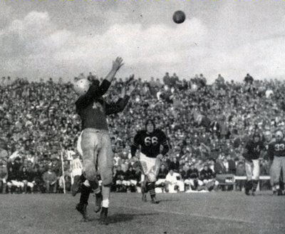 BOSTON'S NFL EAST CHAMPS November 8, 1936 ... One dazzling third period aerial attack gave the Green Bay Packers a 7-3 victory over the Redskins. The Pack was outrushed 114 yards to 18 but Green Bay quarterback, Arnie Herber chucked 14 successful passes in 29 attempts for 200 yards. Three of them were strung together in the third period for the game’s only touchdown. They penetrated the Redskin end on five other occasions, but never moved beyond the 40 yard line. Boston marched into scoring position four time but could capitalized only once, on a Riley Smith field goal. The first break of the game went the Packers way on the opening kickoff when Charlie Malone fumbled and Wayland Becker recovered for Green Bay at Boston’s 29 yard line. The Redskins got the ball back but Johnny Blood intercepted a pass. The Packers were forced to punt and Milner partially blocked Herber’s punt. Eddie Britt worked the ball down to the Packer 17, but the drive stalled and the Redskins had to settle for Riley Smith’s field goal. The Redskins marched 60 yards on the opening kickoff of the second half. Cliff Battles broke loose on a run down to the Packer 19. Eddie Britt connected to Charley Malone to get the ball to the 11, but that was it, and the Packers took over on downs. An exchange of kicks gave the Packers possession at their own 43. Herber passes to Milt Gantenbein down to the Boston 42. Herber found Don Hutson a few plays later bringing the down to the Boston 19. Herber connected with Hutson again, and he spun away from Cliff Battles into the end zone. The Redskins staged a late drive starting at their own 23. Eddie Britt carried the ball to the 36 for a first down. Flavio Tosi hauled in a pass in traffic, from Pug Rentner for a first down at the Packer 28. Two plays later Clark Hinkle intercepted the ball for Green Bay. |