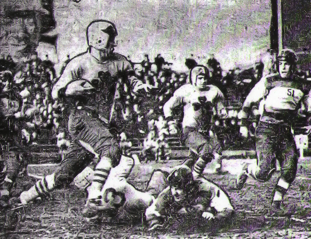 October 24, 1937 ... The Boston Shamrocks had very little opposition even though the game was tied 7-7 after the first period. A 56 yard march produced the first Rock touchdown with Nick Morris going over from the one foot line. The American came right back to score after a Shamrock fumble that was recover by Dick Fife for the Arerks who returned it 75 yards to tie the score. Early in the second period, the Rocks recovered a fumble on a punt at their 12-yard line. A lateral gained seven yards and Pendergast passed to Swede Ellstrom in the end zone to put the Rocks out front with a 14-7 lead at halftime. A pair of zig zagging runs by Earl Bartlett gave Boston two more touchdowns in the third period. The first for 35 yards around the Pittsburgh left side, with the next one scored on a reverse around the Pittsburgh right side. |