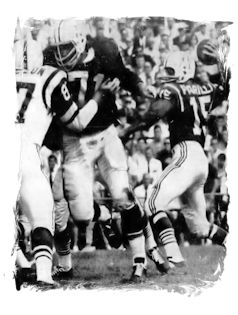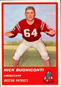 New York got going again and got prevented from going the distance when Tom Stephens, the right corner, slammed down Mark Smolinski on the 12 yard line, after a run from the New York 36. In the second quarter, Parilli, Garron, Cappelletti and Crawford got a big lift from Tony Romeo. The scoring started at the five yard line and was kept alive at the New York four, when Cappelletti made a diving grab of a pass. Billy Lott ran it in from there and Cappelletti added another extra point. Again, the Jets zoomed back. Dick Wood took it 80 yards in seven plays, and the payoff came with a four yard flip to Bake Turner, who outran Ross O'Hanley and Bob Suci in the corner of the end zone, making it a 14 to 14 game. The Jets first try to go ahead, was thwarted by Dick Felt's interception on the Patriots 21 yard line. The next time the Jets had the ball, it ended when Nick Buoniconti took the throw on the 15 yard line and made it out and 38. Parilli and Romeo teamed and got it close. Cappelletti booted a 31 yarder that sent the Pats up for good, 17 to 14. Then in the fourth period, John Stephens, playing at the cornerback position, intercepted a pass on the New York 31 yard line. He made it down to the ten where Parilli ran in the ball himself, making the score 24 to 14. The next time, Jack Rudolph and Buoniconti rushed the kicker, Curly Johnson, and forced a short punt. Larry Garron on two carries went 32 yards. From the 33 yard line, Parilli hit Art Graham for the next score. Stephens intercepted again on the Jets 45 yard line and made it down to the 26. Cappelletti caught a pass at the 15 and Harry Crump first went to the six yard line and then to the four yard line on two carries. Ronnie Lott bulled the ball in from there and Cappy added another extra point. The game revealed how well Babe Parilli could pass, Larry Garron could run, and how Tony Romeo could catch. Tom Yewcic also somehow managed to kick a punt around the lineman who was smothering him. |