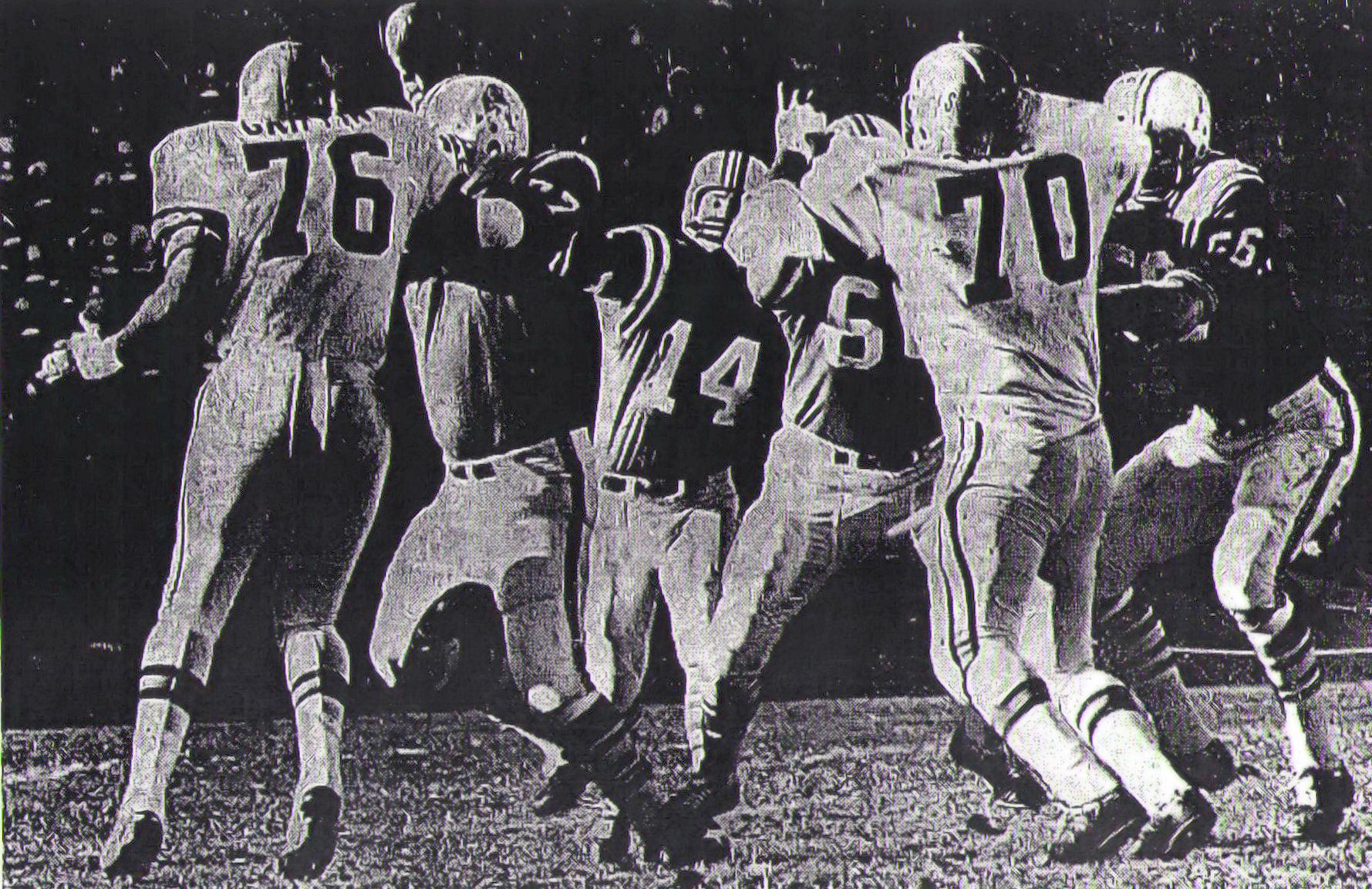 Two plays later, Jim Cheyunski made a diving pass interception at the Cinci 43-yard line and returned it 22 yards, giving Pats the ball back. Sherman hit Jim Whalen on the first of two touchdown receptions. making it 12-0. Cappy got a chance to get in the act by nailing an 18 yard touchdown pass down the middle to make it 19-0. Next, rookie Cinci punter Rex Keeling muffed the snap from center, giving the Pats good field position and setting up the next score for Jim Nance to make it 26-0 at the half. The Bengals who were only able to muster two first downs in the first half, got moving in the third period when John Stofa led them 80 yards and finally hit Estes Banks for their first points. The Pats came right back with a drive of their own, capped by Sherman's second touchdown toss to Whalen. With the game coming to a close, Stofa hit Rod Sherman for the last score of the day. |