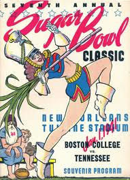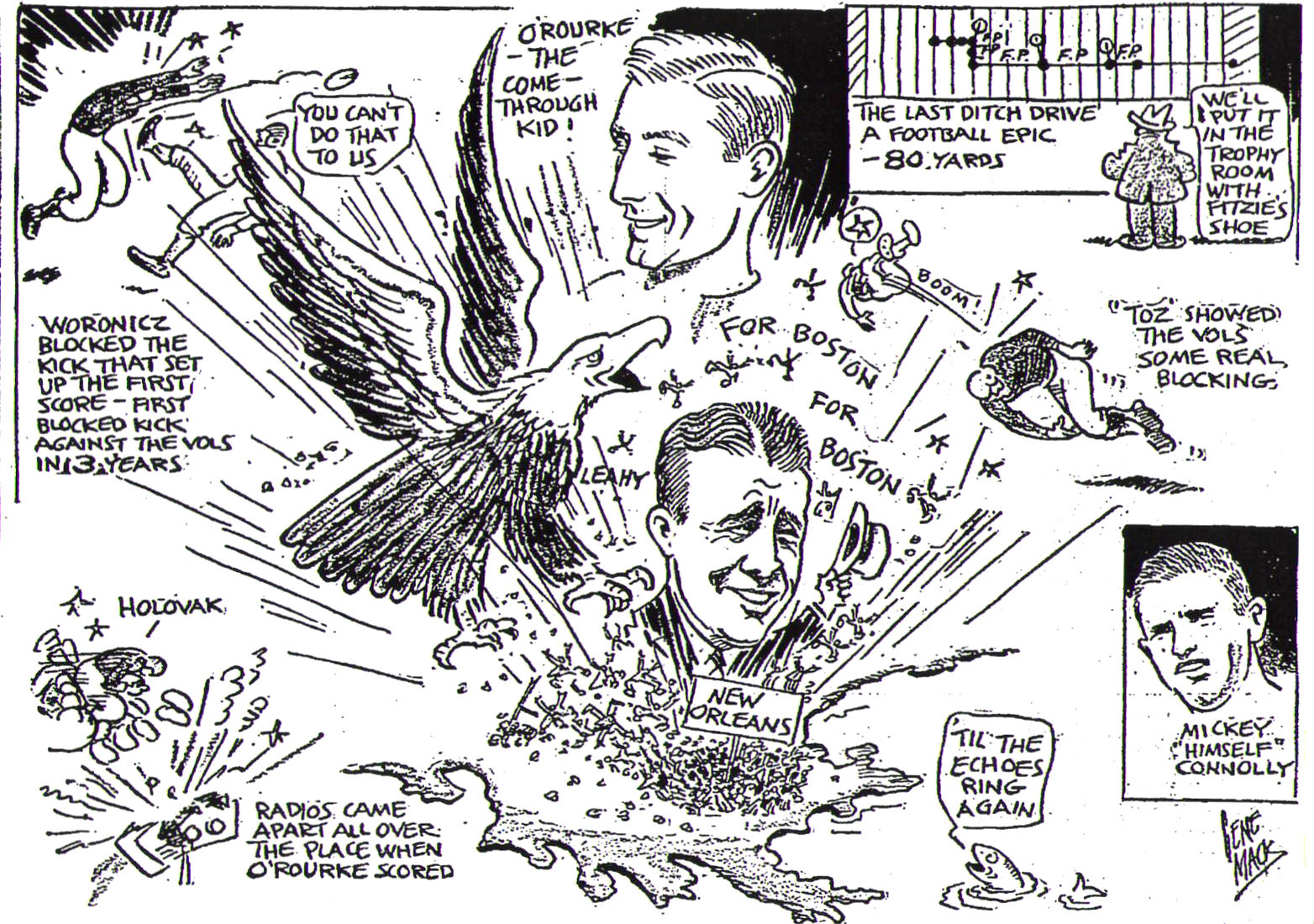 Charlie O'Rourke makes the January 1, 1941 ... The Boston College team just wouldn't stay down and came from behind twice to score an impressive 19-13 win over the Tennessee Volunteers in the Sugar Bowl Game. Two time Charlie O'Rourke had been the goat. His fumble of a punt in the first few minutes set the stage for Tennessee's first score. And again, in the third quarter, he was called for pass interference giving Tennessee the impetus to score again. O'Rourke was battered and bruised and the Eagles were exhausted and it looked like the end. But O'Rourke and his team bounced back and plowed the Vols into the turf on a fake pass play that had only been put into the lineup yesterday. Tennessee capitalized on O'Rourke's fumble as they marched 46 yards for the first score. The Eagles spent the rest of the first period scrambling for their lives. Once they made it down to the Vols' 15-yard line only to be intercepted. As the Eagles came on the field for the second half, they were losing 7-0. With Mickey Connolly as the spark, the Eagles evened the count at 7-7. Henry Woronicz started it off by blocking a Bob Foxx punt, where Joe Zabilski came up with the ball on their 17-yard line. Two plays later, Mickey Connolly, who started the second half in place of O'Rourke, swept around left end behind Hank Toczylowski to beat the pack into the corner for the touchdown. Tennessee roared back, however, on a savage 55-yard march and made it 13-7. The Eagles were down but far from out. They went on to tie it up again on a 68-yard journey which Mike Holovak brought to a happy conclusion with a power buck over the middle.