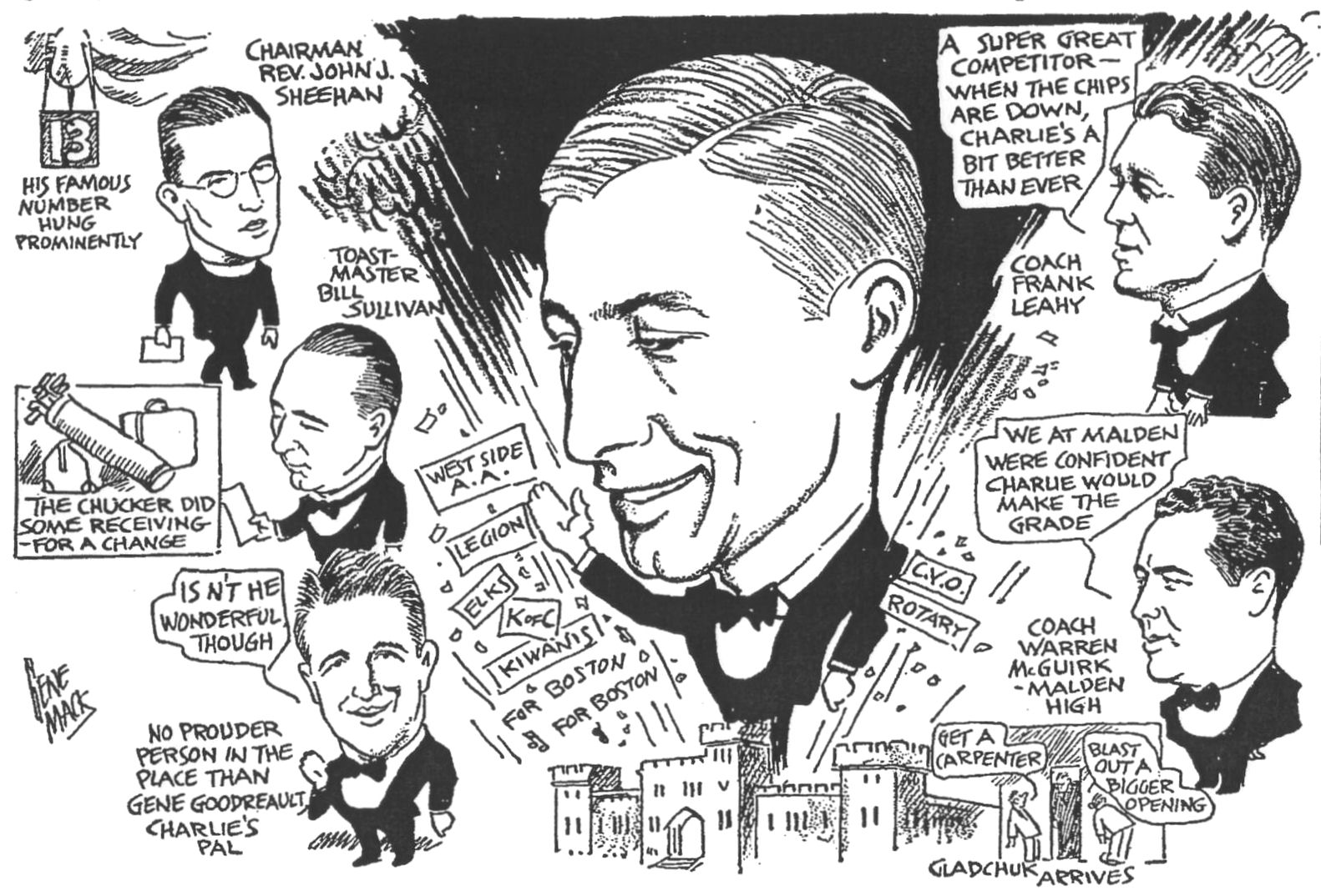 THE GREATEST EAGLE FOOTBALL TEAM December 3, 1940 ... At the Gridiron Club dinner held at the Hotel Lenox, Coach Leahy expressed his desire to remain B.C.'s head coach for a long long time. Charlie O'Rourke won the George Lowe Jr Memorial Trophy as the top New England college football player for 1940. December 4, 1940 ... Charlie O'Rourke was honored by 1200 friends, neighbors, relatives and associates at a party held at the Malden Armory. At the party O'Rourke was offered a job as the football coach and teacher for Malden High School, bringing applause from the crowd. He also received a telegram from the Detroit Lions, offering a job on their team next year.