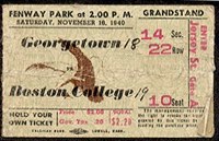 THE GREATEST EAGLE FOOTBALL TEAM November 12, 1940 ... Led by Eddie Doherty, the freshmen Eaglets romped over their counterparts from Holy Cross by a 20-9 score, before 13,000 at Alumni Field. The Eagle varsity was indoors this afternoon preparing for their battle with the Hoyas. The team was given new plays, especially designed to be used for Georgetown. Mistakes in the blocking assignments of the offensive line, in the B.U. game was a flaw and so the linemen were concentrating on their play execution. A huge torchlight parade is scheduled for Friday night by the B.C. student body. The parade will end at the Hotel Continental in Cambridge where the Boston College Club is holding a sports night and a reception for the B.C. coaches. November 13, 1940 ... Coach Leahy led his team thru workouts in the mud of Alumni Field today. Not wanting to be indoors again, he opted for a full workout in the less than perfect playing conditions. He pushed his various units through signal drills with the wet ball, and had Charlie O'Rourke working overtime punting the heavy wet football. The coach hopes to exploit the excellent punting of O'Rourke to his advantage on Saturday. The team finished the practice with wind sprints and five laps around the ball field before Leahy lectured for about 30 minutes. November 14, 1940 ... Defensive assignments dominated the practice. With Kissell out this week, the coaches have been working Bob Jauron very hard and with Mike Holovak limping around, Jauron may get the start. |