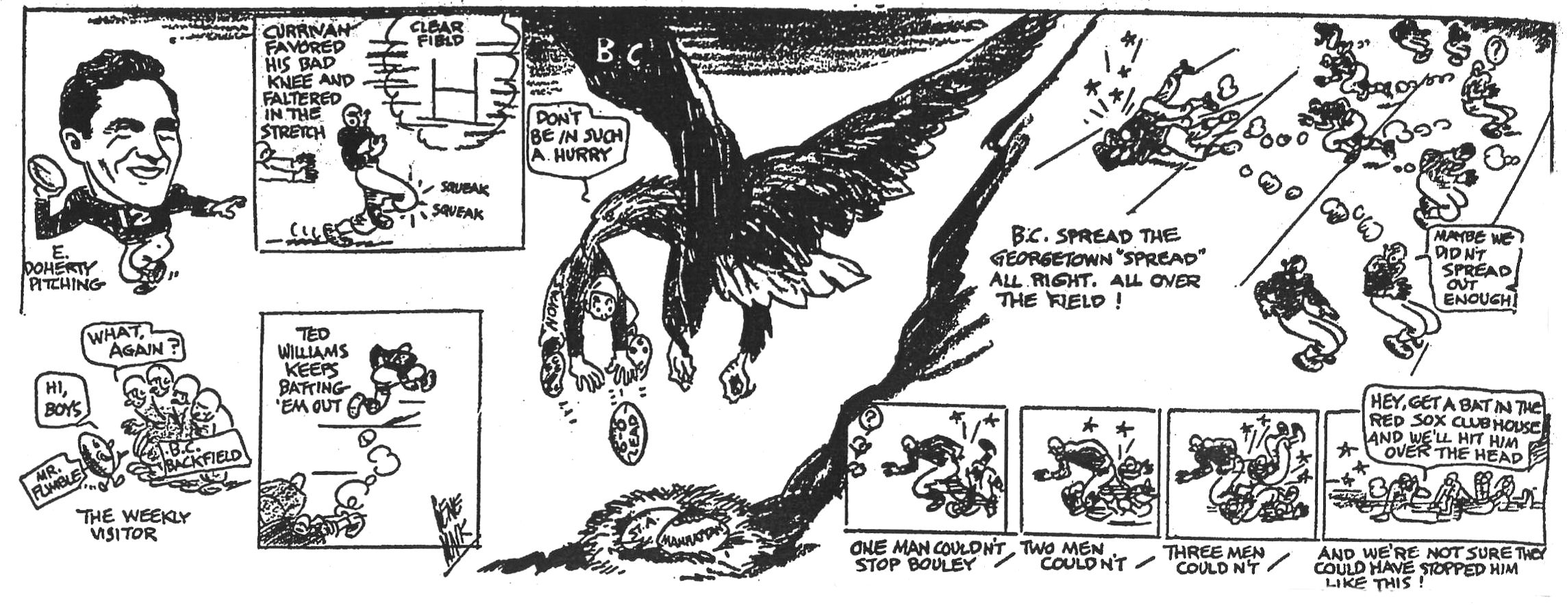 October 25, 1941 ... In a repetition of their 1940 thriller, the Eagles again dug themselves out of the hole and downed the Georgetown Hoyas by a 14-6 score. The first two minutes were a nightmare for the Eagles as Georgetown hopped away to an early lead resulting from a B.C. fumble on their own 13-yd line shortly after the initial kickoff. Four plays later Georgetown scored on a 14 yard aerial. The maroon then started from their own 20-yard line and tramped 80 yards to even the count. An arching pass from Ed Doherty to Eddie Zabilski carried the Eagles over from the twenty eight. Georgetown missed a couple of chances to take the lead, with 39 yard and 16 yard field goal attempts. In the last quarter B.C. increased their slender margin as they swept the length of the field for the next score. On this march a perfectly executed pass from Doherty to Don Currivan ate up 52 yards and put the Eagles down on Georgetown's 21-yd line. Frank Maznicki ripped over tackle for fifteen more and then ran over right guard for six and a touchdown. The Eagles had a statistical advantage all around; first downs (9-8), rushing yards (169-59), and passing yards (106-100). Three times in the first 20 minutes of the game, Boston College lost the ball on fumbles. |