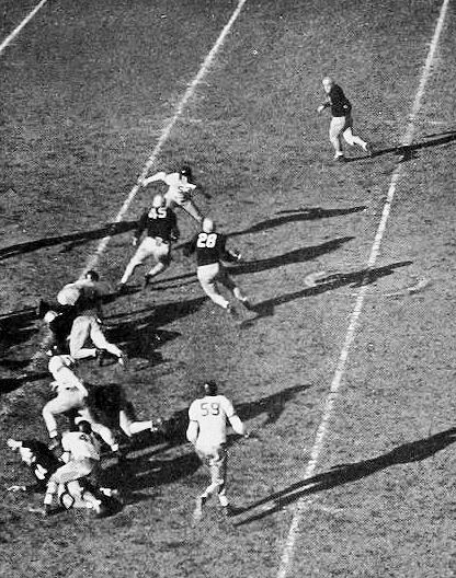 November 22, 1941 ... A 95 yard runback by Butch Kissell on the opening kickoff set the tone as the Eagles scored all their 19 points within the first seven minutes against the Terriers at Fenway Park. Less than three minutes later the Eagles took possession on the B.U. 43-yd line. The last 29 yards were gobbled up by Frank Maznicki. The hand on the bleacher clock was just moving past seven minutes when Wally Boudreau directed the Eagles on a 69 yard parade toward the end zone with Maznicki again putting on the final touch. Not until the second half did B.U.'s Walt Williams score on a 14 yard run, to make the score 19-7. |