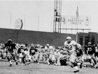 October 8, 1955 ... Fullback Turk Petraca lit a spark under a lethargic Eagle team to inspire his team to roll over Villanova at Fenway Park. Petraca scored twice in the third period to break a 7-7 deadlock to give B.C. the victory in its first stern test of the season. B.C. marched 63 yards for the tie-breaking touchdown and Petraca carried the last 30 yards himself. Quarterback Billy Donlan also scored twice over a Villanova team that had already beaten Baylor and Kentucky. B.C. had its first touchdown set up by a Villanova fumble on the third play of the first period. They had the ball on the Villanova 34-yard line and took eight plays to score. Donlan snuck it over for the touchdown. The Eagles reciprocated with a fumble five minutes later on their own 33-yd line and Villanova scored on a Johnny Lammers pass to end Van Injalan. B.C. took the second half kickoff and marched 63 yards to break the tie. Billy Alves carried up to Villanova's 45 and Petraca made it to the 40 and then the next four times to finally break the tie with a six yard buck for the score. Later on in the period sophomore halfback Larry Plenty and Henry Sullivan did most of the carrying to get the ball down to the 11-yard line to set up the next score. Petraca then took the ball and scored from the six to give the Eagles a 21-7 advantage. Villanova scored their second and final touchdown on a beautiful 31 yard dash by Davey Parr on a 71 yard march. Donlan set up the final touchdown in the fourth period with a great 39 yard pass to Tom Mangarelli for a first down at the two yard line. Donlan carried twice and finally pushed it in for the score to make it 28-14. Turk Petraca gained 80 yards of the 190 yards rushed. The Eagles only threw eight passes but had five completed. |