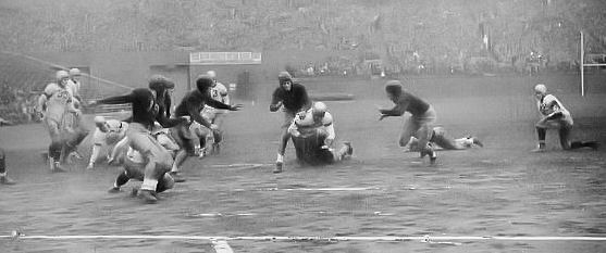 November 18, 1939 ... Boston College's Vito Ananis scored every point for the Eagles, proving once more that he is the top running back in Eastern football. Ananis had scored the winning touchdowns this year, against Temple, St. Anselm, Auburn and Detroit this year. This time he did it all against Boston University. The Terriers put up a stubborn line defense and did everything they could to win this game, but their vaunted passing attack never clicked and their running game made no headway. The Eagles on the other hand smashed away at the Terrier line for three touchdowns. They converted two B.U. errors into two touchdowns and paraded 67 yards in the final period for the last score. Early in the contest, the Terriers received the opening kickoff and after their second play, fumbled. Ananis recovered the Terrier fumble on the B.U. 30-yard line. Pete Cignetti blasted 23 yards on a buck for a first down at the 7-yd line, and then he went over center to the four. Ananis then skirted four yards around end for the first score standing up. The rest of the half was conservatively played, with the Terriers holding them to a standstill. Then, Cignetti intercepted a B.U. pass at their 45-yd line and carried up the field another 10 yards. Charlie O'Rourke started as his own 45-yd line and hit Ananis on a long pass with only 20 seconds left in the first half. The final score occurred late in the last period on their only long march of the game. It started when Ed Cowhig recovered a Terrier fumble at the Eagle 34-yard line. During the next seven plays, B.C. covered those 66 yards. O'Rourke hit Cowhig for 12 yards. Cignetti carried the ball down to the 31. O'Rourke escaped the B.U. rushers and took the ball down to the 16. Ananis made a wide sweep for a yard and then carried on a fake reverse over the Terrier's right guard for the score and his third touchdown. He then drop-kicked the extra point accounting for every point the Eagles scored during the game. Scoring 19 points, Ananis became the leading major college scorer in the East with 61 points. |