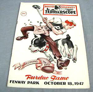 October 18, 1947 ... Boston University's bid for national pigskin prominence suffered a rude 62-7 jolt from the Purdue Boilermakers at Fenway Park. It didn't take long to see why Purdue was able to outrush and outplay Notre Dame a week ago. The first time Purdue touched the ball, they were off to the first of their nine touchdowns. Vastly superior in all departments, possessing a large edge in height and weight, Purdue ran as wild as it was able to do. In the second half the Purdue second stringers also ran all over the Terriers in their eagerness to get a chance to play and impress their coaches. The smallest player on Purdue was Harry Szulborski was the most difficult to tackle and produced the longest run of the day, an 85-yard jaunt in the second period. Boston University took the opening kickoff and immediately Bob Hatch was smeared, setting the tone as to what was to follow. If Coach Donelli can take a positive out of the game, it could be that his kickoff return team had plenty of practice as did his punter. |