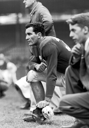 October 29, 1949 ... B.U.'s undefeated football team shut the lights off Scranton at Fenway Park in a 46-6 rout. The Agganis Assassins bettered their nation leading 425-yards per game offensive average, with 517 total yards. Agganis tossed four touchdown passes for 14 TD tosses in five games, moving in on the collegiate record of 22. He threw the ball 25 times for 14 completions and 218 passing yards, as well as running the ball himself numerous times as well as doing the kicking twice on kickoffs. George Sulima is a superb pass receiver and complimented Agganis' great passing ability. Sulima caught two passes for touchdowns and set up a third. B.U. drove 73 yards for its first score and the second one came via a recovered fumble by Lou Beardell to set up an Agganis to Sulima touchdown reception. Agganis started the third march himself, intercepting a pass at his own 48, and hitting Sulima with a pass at the Scranton 35 who took it in for the score. After the half, Johnny Kastan picked off a pass and ran 40 yards for the fourth B.U. score. A pass from Agganis to Tom Oates brought the fifth touchdown, climaxing a 55 yard drive. Billy Pavlikowski set up the sixth touchdown by picking off another Scranton pass at the visitor's 45-yd line, with an Agganis-Oates combination for the payoff. Johnny Toner steered the 68-yard journey that netted the final score, completing two passes, with Red Czarmota taking in through for the TD. Coach Donnelli played Agganis for more than 50 minutes, coming out in the third quarter, but going back in the next three times B.U. had the ball. |