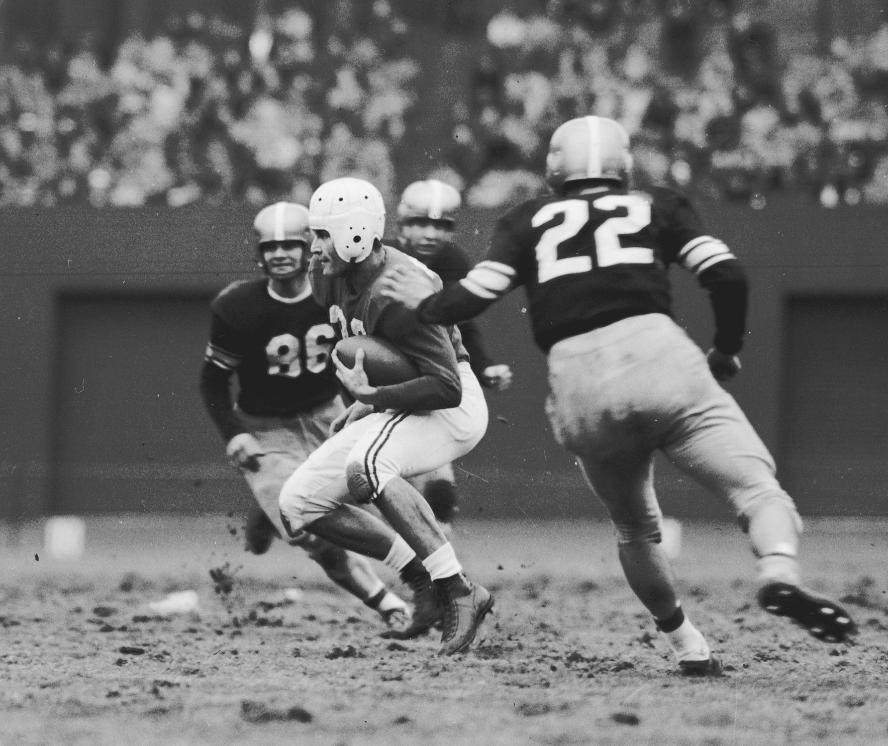 October 18, 1952 ... Defensive left end Jim Meredith saved a battered and yielding Boston University eleven in the closing moments, to save a 33-28 victory at Fenway Park, in what was a tremendous offensive game. Meredith swarmed on a loose ball at the B.U. fifteen with two minutes left to play, as William & Mary was steamrolling its way toward the B.U. goal line and a winning touchdown in huge gulps. The genius of Harry Agganis was written all over this game, as he towered over everyone on the field in the first half and bailed his team out midway through the final period with a one shot pass for the winning touchdown after guard Gerry Keane had recovered a W&M fumble at their 17-yd line. Agganis found Tom Gastall in the right corner and sent an arrow right at him for his fourth touchdown throw of the game. At the time, the Virginians were pushing the Terriers all over the field. W&M got the 7-0 jump in the first quarter, then was flooded under four B.U. scores in the second period. Agganis pulled the W&M line apart with a series of fakes. Don Defeudis scored one on a pitchout from Agganis and another on a 41-yard pass play. Then ends Tom Gastall and Tom Lavery each plucked an Agganis pass out of the night to give B.U. a 27-7 halftime lead. During the 88 yard drive for the second score Agganis passed five times in 14 plays. The game was turned on its back in the second half when W&M tremendous power took hold. The Virgians tore off large chunks on the ground and capped a 70 yard march to take a 28-27 lead after the third period. B.U. was simply unable to stop them at this point and they were tearing the Terrier defense to ribbons. But Agganis crowned an upset when Keane gave him a chance with his fumble recovery at the W&M 17-yd line. Agganis was 14 of 22 in the passing department for 187 yards. He also intercepted two passes and let loose with a couple of 30-yd runs and averaged 43 yards with his punts. |